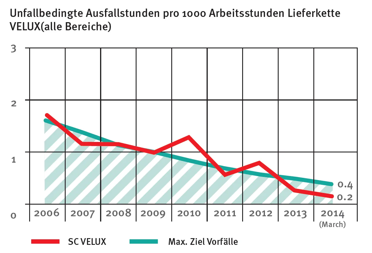 Greifbare Ergebnisse bietet die Sicherheitsstatistik. Einige der ersten Standorte, die das Safety Excellence Programm eingeführt haben, hatten in den vergangenen fünf Jahren keinen einzelnen Ausfalltag zu verzeichnen. Seit Beginn des Programms im Jahr 2010 konnte die Velux Gruppe die Gesamtzahl der Erste-Hilfe-Fälle von rund 5.000 auf etwa 2.500 im Jahr 2013 verringern. Die Unfallhäufigkeit (Ausfalltage pro 1 Mio. Arbeitsstunden) ist von sieben vor dem Programm auf derzeit einen im April 2014 gefallen.