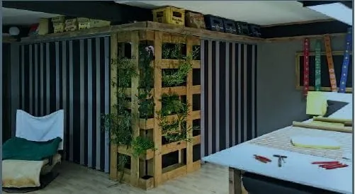 entschieden.“ Zugrunde liegt dabei die Kollektion Living Colours: Die Hauptfarbe ist Anthrazit, davon heben sich Lamellen in Mittelgrau und einem Karamellfarbton ab. Für seine Werkstatt strebt Füßl einen Vintage Industrial Look an. Um diesen perfekt zu machen, hat der Raumausstattermeister zwischen den beiden Lamellenanlagen eine an eine Europalette erinnernde Holzkonstruktion installiert. Dort lassen sich z.B. Pflanzgefäße positionieren. „Wir begrünen die Wand und wollen so einen freundlicheren Charakter in den Raum bringen.“