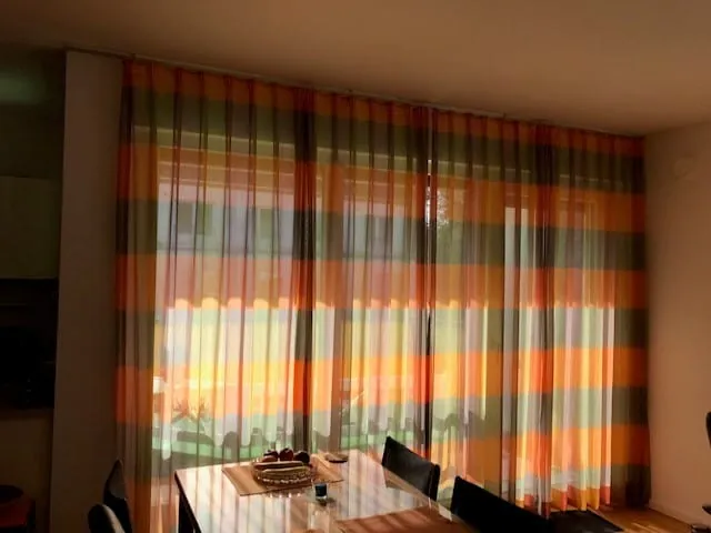 Ganz im Gegensatz zum Sichtschutz, welchen die Expertin im Wohnzimmer des Kunden anbrachte. „Dort habe ich eine auffällige, aber trotzdem elegante Schiene von Interstil installiert. Die bereits vorhandenen, in mehreren Orangetönen gehaltenen Vorhänge dienen dabei weiterhin als Sonnenschutz“, sagt Weigand. Zusätzlich fungieren leicht durchlässige Plissees als Sicht- und Sonnenschutz, obwohl sich die Umrisse noch erahnen lassen. „Der Kunde wünschte das, um die gegenüberliegende Hauswand ein wenig abzudecken.“ Der Clou sei, dass der Bewohner trotz Sichtschutz mittels Plissees oberhalb aus dem Fenster schauen könne, um den Himmel zu erkennen.