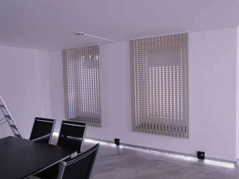 Schön hat sich in diesem Fall für ein mit Lasercut ausgeschnittenes Wabenplissee entschieden. Die Idee zur Umsetzung stammt von ihr selbst. Die Lösung hat Löcher von beiden Seiten. "Das gibt eine spannende Optik", sagt die Raumausstattermeisterin. Das Produkt ist vom Anbieter Jab. Insgesamt kamen zwei dieser Plissees zum Einsatz, beide mit einer Höhe von drei Meter und einer Breite von 1,20 Meter. Sie sind an der Decke des Büros und nicht an der Laibung montiert. Da der Kunde viel Wert auf die Optik legte, sind weder Kette noch andere Bedienelemente sichtbar. Bedienbar sind die Plissees mit einer Unterschiene – sowohl nach unten als auch nach oben. An den übrigen