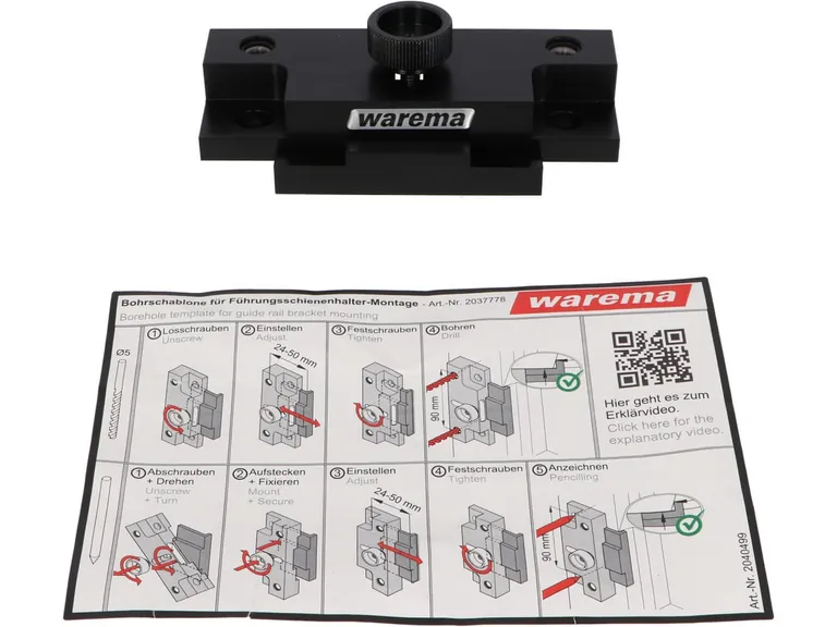 Einfach anlegen, direkt bohren oder punktgenau anzeichnen – mit der neuen, speziell konstruierten Bohrschablone lässt sich das Fenster schnell, sicher und exakt für die Montage der Führungsschienenhalter vorbereiten. Die handliche Schablone ist einfach zu benutzen und bietet dabei größte Genauigkeit. Sie eignet sich für alle gängigen Warema Abstandshalter.