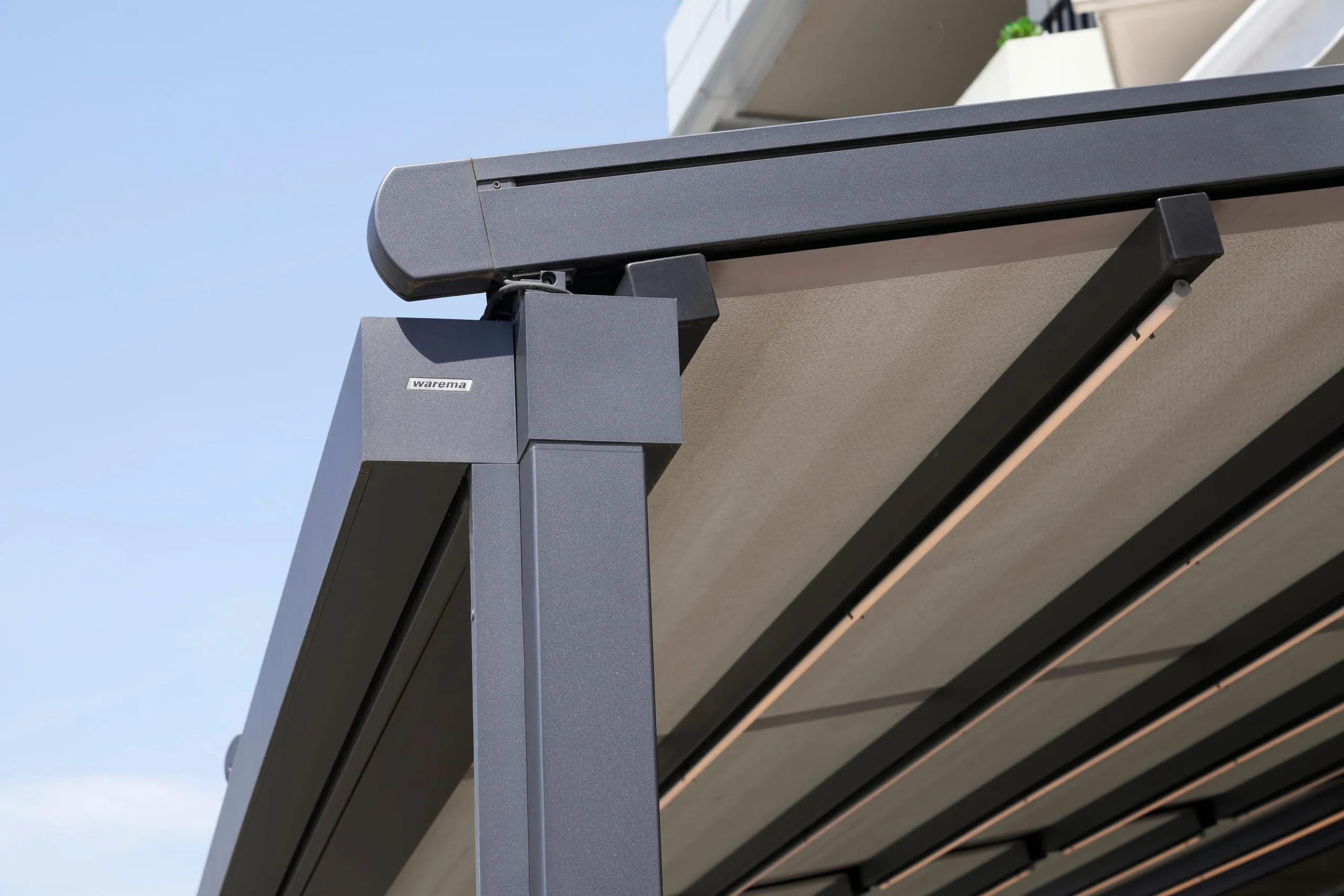 "Die elektrisch bedienbare Perea P70 zeichnet sich durch Gegenzugtechnik über Zahnriemen aus. Dieser hält das Tuch jederzeit auf Spannung und sorgt für eine hohe Windstabilität bis Windstärke 7", sagt Bergmann. Mitlaufende Verstärkungsprofile spannen den Stoff zusätzlich, wodurch ein kontrollierter Regenwasserablauf gewährleistet ist. Die vorderen querliegenden Rahmen sind als voll integrierte Entwässerungsrinne konstruiert und leiten das Wasser zu den Außenpfosten, in denen es nach unten abgeführt wird.