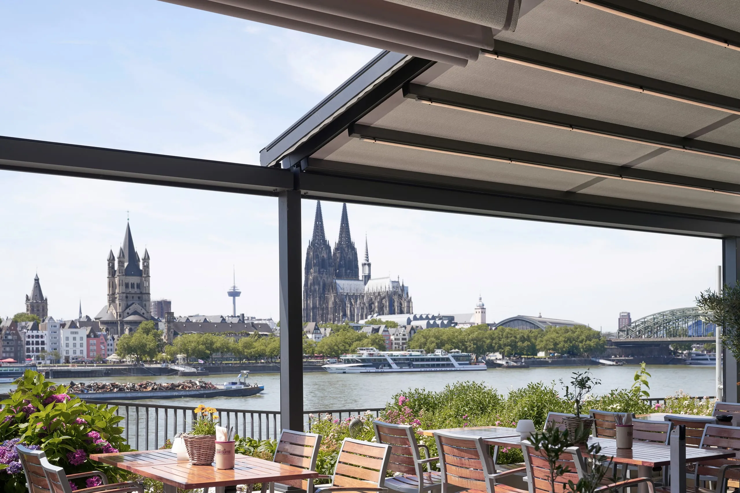 Die Terrasse des Brauhauses Kaiser Konstantin in Köln-Deutz ermöglicht den freien Blick auf die Altstadt, den Dom und den Rhein. Bei frisch gezapftem Kölsch genießen die Gäste hier traditionelle deutsche und mediterrane Küche – unabhängig vom Wetter. Möglich macht das eine Terrassenüberdachung von Warema.