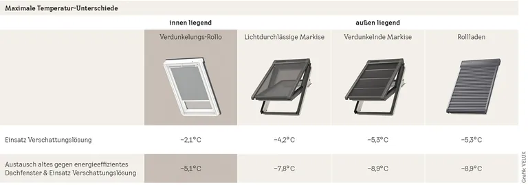 Obwohl die außen liegende transparente Markise noch Licht in den Raum lässt, war der Hitzeschutzeffekt mit ihr schon etwa doppelt so groß wie beim Rollo: Eine bis zu 4,2 Grad Celsius niedrigere Temperatur als in einem Raum ohne jegliche Verschattung. Damit wird deutlich, dass eine effektive Hitzereduktion nur mit außen vor dem Dachfenster liegenden Lösungen möglich ist. Im Gegensatz zu innen liegenden Rollos verhindern sie, dass die Sonne auf die Scheiben trifft und die Temperatur dadurch im Raum deutlich steigt.