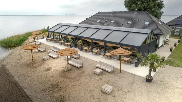 Der Strandclub Telstar Beach im niederländischen Wassersportparadies Het Wolderwijd steht für ein breites Angebot an Surfaktivitäten. Von der Terrasse am Beachpavillon aus können Gäste das bunte Treiben beobachten oder sich kulinarisch verwöhnen lassen. Seit Kurzem beschattet ein Terrassendachsystem von Cornels den Außenbereich – ausgerüstet mit wasserdichtem Sonnenschutzgewebe von Serge Ferrarri.