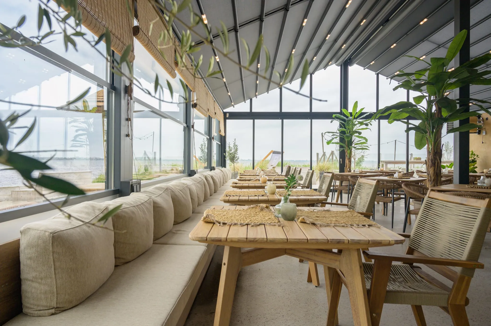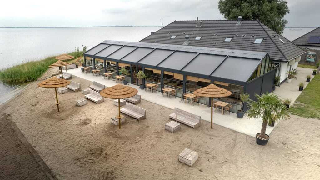Das Projekt wurde federführend von Cornels umgesetzt, einem niederländischen Hersteller von hochwertigen Outdoor Living Systemen, die Installation erfolgte durch den Fachbetrieb Palmo B.V. Hierzu wurde ein Terrassendachsystem mit anthrazitfarbener Textilbespannung geplant, das mit doppelt verglasten Schiebetüren und festen Aluminiumrahmentüren ausgestattet wurde. Das Resultat fügt sich nahtlos in das bestehende Restaurantgebäude ein und verdreifacht nun die nutzbare Fläche auf beeindruckende 220 Quadratmeter.