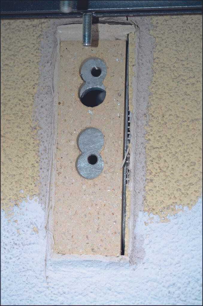 Bemerkenswert: Den mittleren Markisenhalter hatten die Monteure gar nicht mit dem Mauerwerk verbunden – er hing lose vom Schutzdach der Markise herab. In allen anderen Fällen waren die Konsolen mithilfe fünf Zentimeter langer Gewindeschrauben an Stahl-Rechtecken befestigt, die in Aussparungen des Wärmedämmverbundsystems (WDVS) eingesetzt und mit Holzwerkstoffplatten verkleidet waren. Das Problem: Für die verbaute Unterkonstruktion fehlte der Nachweis. Ebenso hätten die Befestigungsschrauben aus galvanisch verzinktem Material gemäß DIN EN 1993-1-8 gar nicht zum Einsatz kommen dürfen.