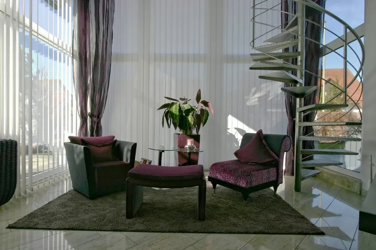 "Der vorrangige Wunsch des Kunden war es, aus dem bestehenden Wintergarten einen repräsentativen und wohnlichen Ort zu gestalten", sagt Gerhard Ostenried. Daraus entstand ein in Hinblick auf Sonneneinstrahlung und Sichtschutz regulierbarer, harmonisch-lebendiger Ort mit Eleganz für Partys und privaten Momenten. Der komplette Entwurf – die Auswahl, Lieferung und Montage der Möbel, Beleuchtung, Spachteltechnik sowie Bezugs- und Dekorationsstoffe – stammte von dem Einrichtungs-Fachbetrieb, der diesen auf den weißen Wintergarten, die Edelstahl-Treppe und den Steinboden abstimmte. Beim Sonnenschutz fiel die Wahl auf eine Kombination von fließendem lilafarbenem Dekorations-Stoff (JAB) und weißen, flexiblen Vertikallamellen (MHZ). "Die zweckerfüllenden und schlichten Vertikallamellen gewährleisten die Regulierung des Sonnenlichts und dienen als Sichtschutz; der halbtransparente Dekorationsstoff strahlt Gemütlichkeit und Wohnatmosphäre aus", erläutert Gerhard Ostenried. Die Herausforderung bei der Sonnenschutz-Montage bestand nach seinen Angaben in der stabilen Verbindung von Gardinenstangen (Leha) und Vertikalanlagen, welche es vor Ort mittels einer durchdachten Kombination und handwerklichen Geschicks durch eine Feingewinde-Verbindung herzustellen galt.